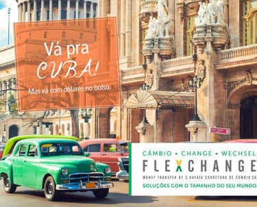 Usei a chamada “Vá pra Cuba!” para acionar o imaginário cultural do destino que envolve uma questão política, mas de maneira sutil, seguida do complemento “Mas vá com dólares no bolso.”, que entrega a orientação prática. A imagem com carros clássicos reforça a identidade visual cubana, enquanto a assinatura da Flexchange dá credibilidade e posiciona a marca como especialista em soluções para viajantes.