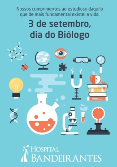 Adotei um texto com tom respeitoso e científico: “Nossos cumprimentos ao estudioso daquilo que de mais fundamental existe: a vida”, acompanhado de uma composição visual com ícones laboratoriais, reforçando o ambiente técnico do biólogo. O resultado é uma homenagem clara, elegante e alinhada ao posicionamento do Hospital Bandeirantes.